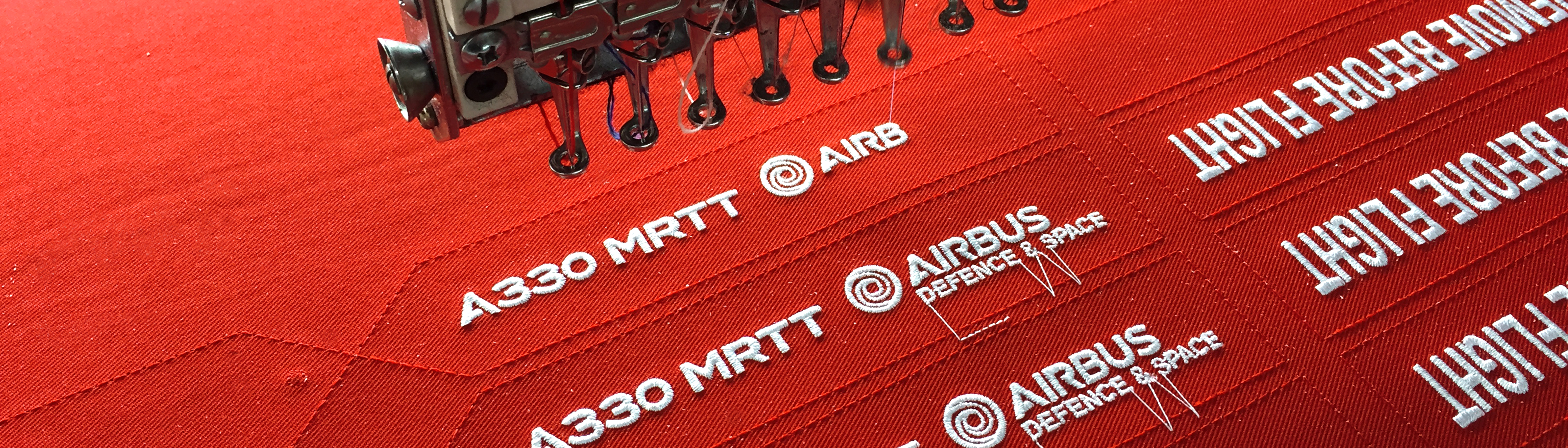 Eine Möglichkeit für die Umsetzung besonders kleiner Anhänger ist die Produktion als doppelseitig gewebter oder bestickter Polyester-Textilanhänger. Die hochwertige Ausführung macht diese Anhänger ideal für den Einsatz im Flugzeug-Innenraum, oder an Consumer-Drohnen.