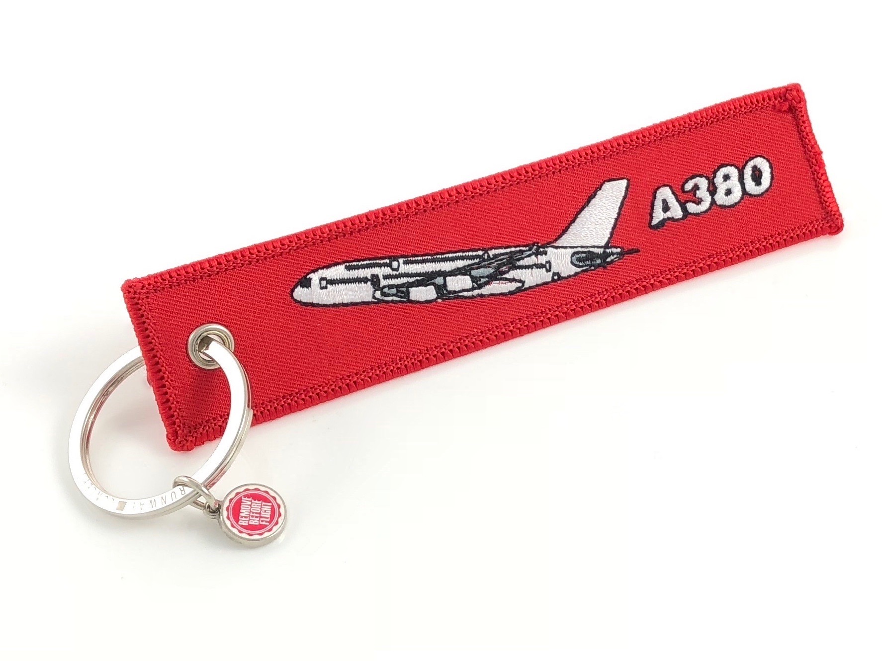 Textilanhänger mit aufgesticktem Flugzeug "Airbus A380", Rückseite: "Remove Before Flight".