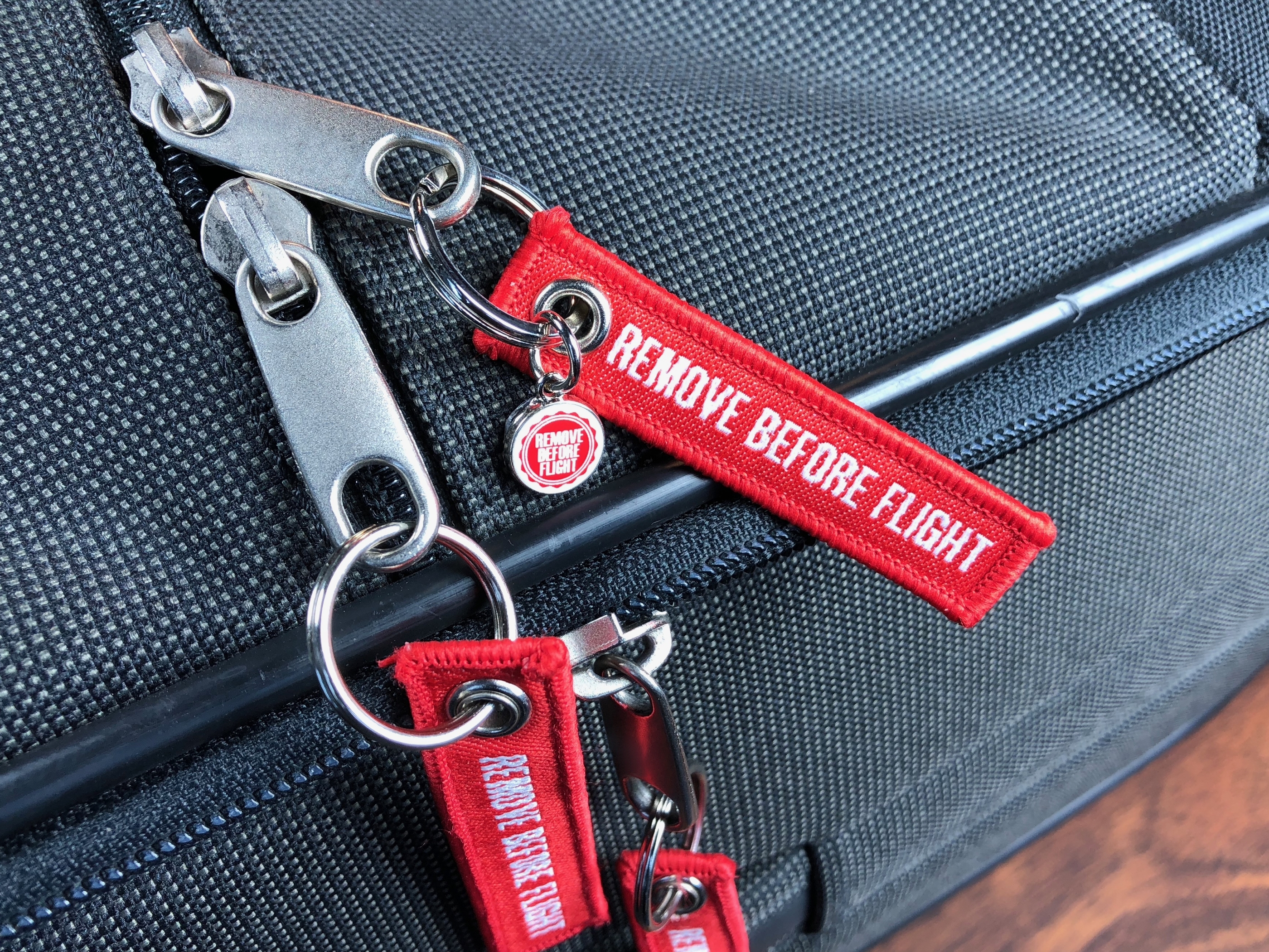 - Montierter Schlüsselring an stabiler Metallöse und "Remove Before Flight"-Markensiegel