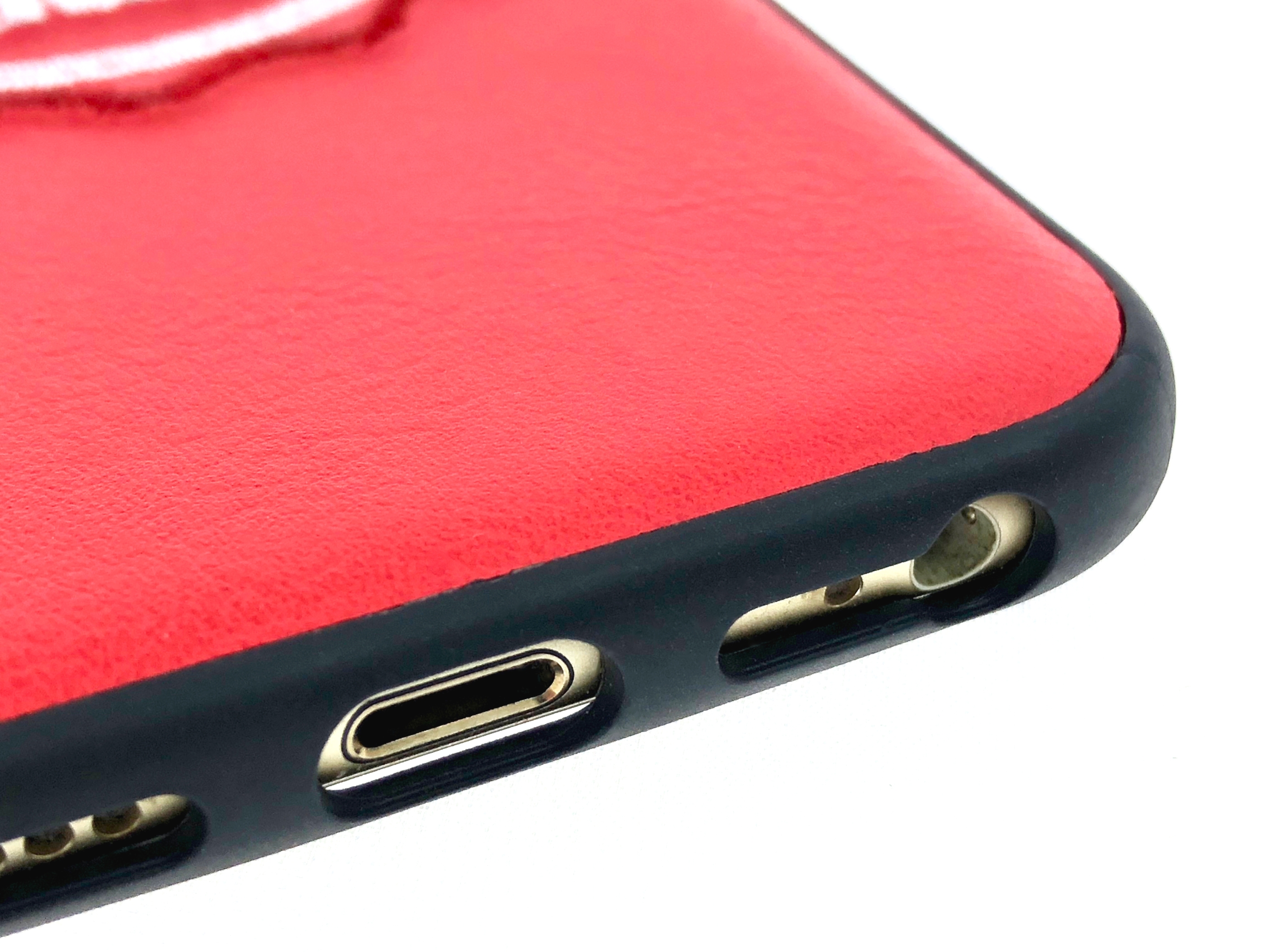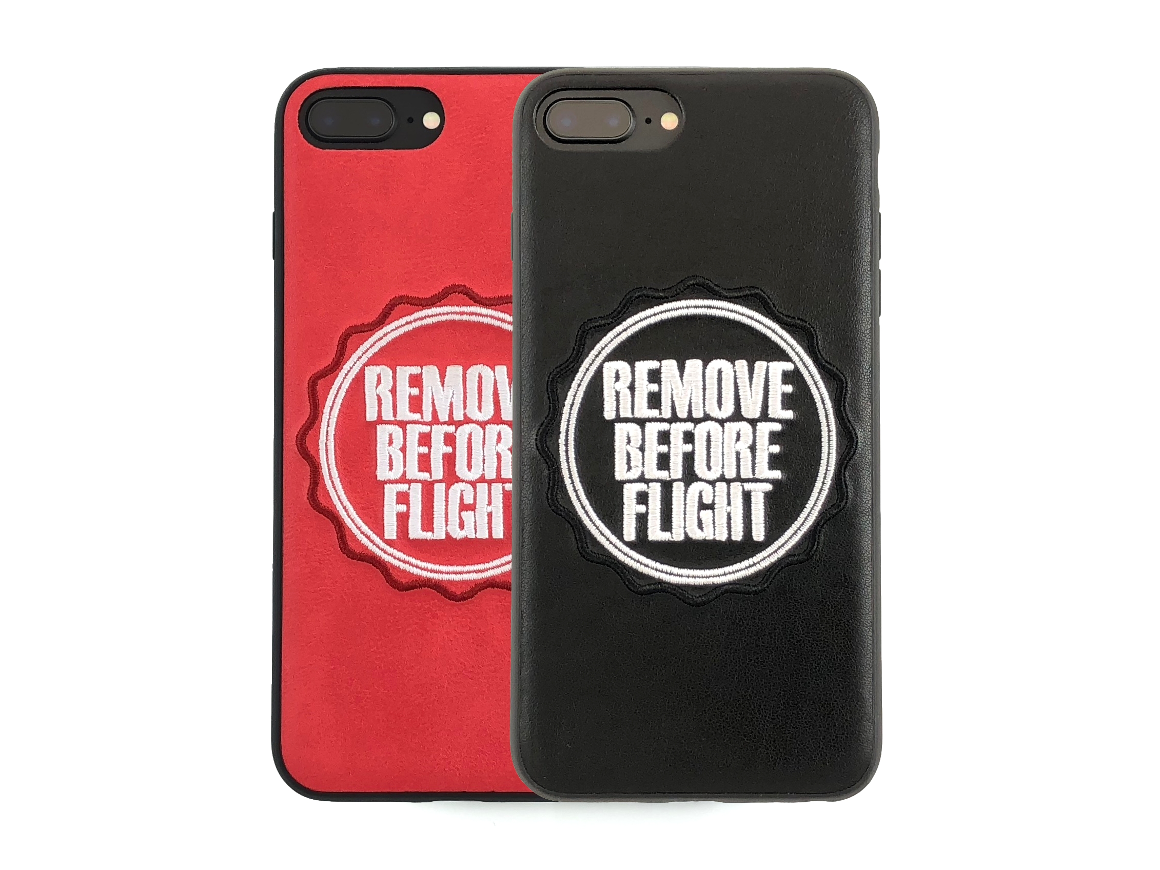 iPhone-Hülle aus hochwertigem Kunstleder mit gesticktem "Remove Before Flight"-Logo.