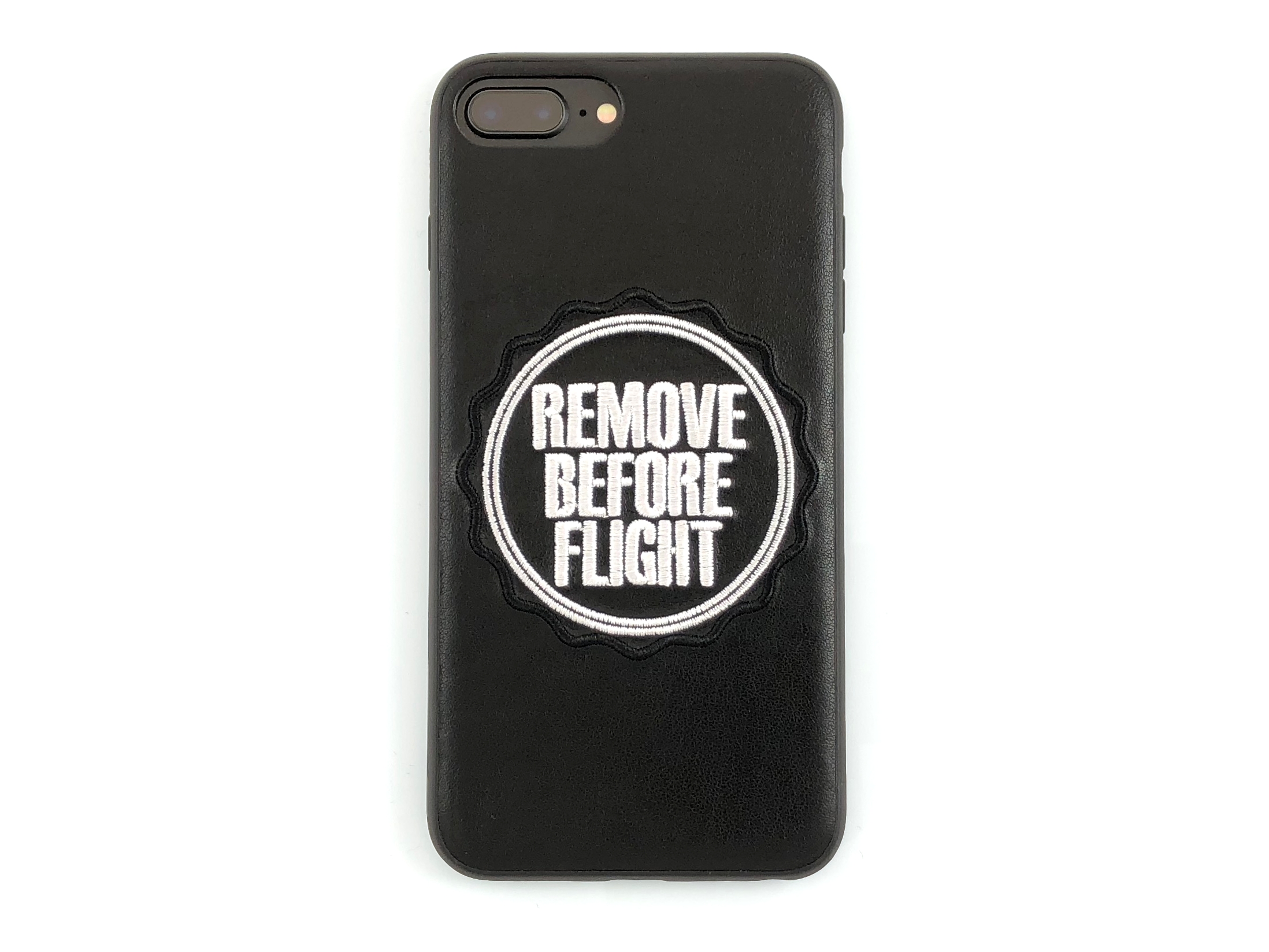 iPhone-Hülle aus hochwertigem Kunstleder mit gesticktem "Remove Before Flight"-Logo.